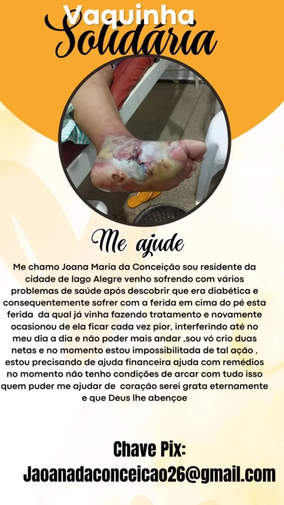 Joana Maria da Conceição, moradora da cidade de Lagoa Alegre, vem enfrentando sérios problemas de saúde em decorrência da diabetes. A situação do pé diabético tem se agravado, mesmo com o tratamento em andamento, e Joana já não consegue mais caminhar.