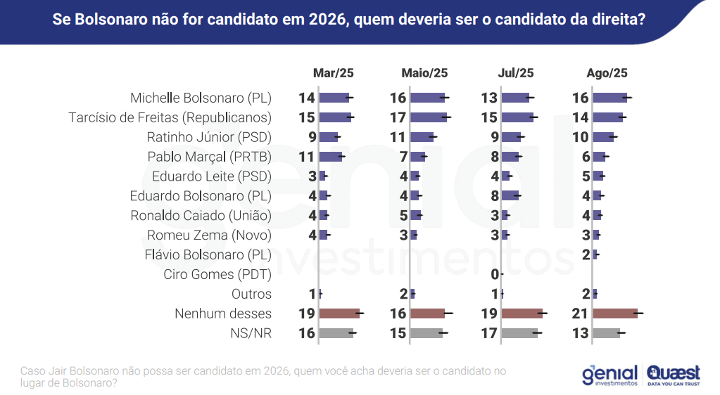 Nos meses anteriores, Tarcísio vinha à frente: em março tinha 15% contra 14% de Michelle; em maio, 17% a 16%; e em julho, 15% contra 13%.